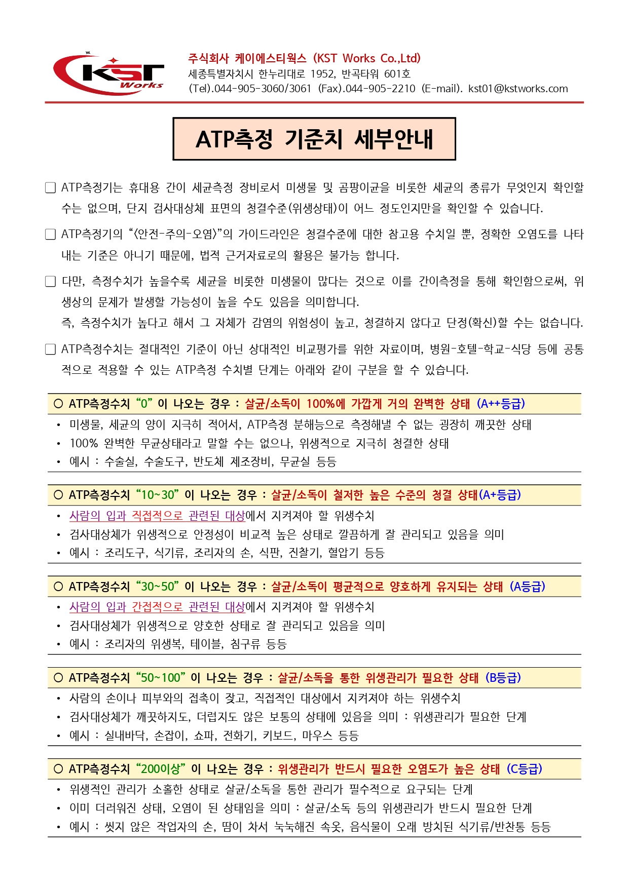 다만 ATP측정 수치가 높다고 해서, 그 자체가 감염의 위험성이 높거나, 청결하지 않다고 단정할 수는 없으며, ATP 측정수치는 절대적인 기준이 아니라 상대적인 비교평가를 위한 자료로 사용하는 것이 좋습니다.