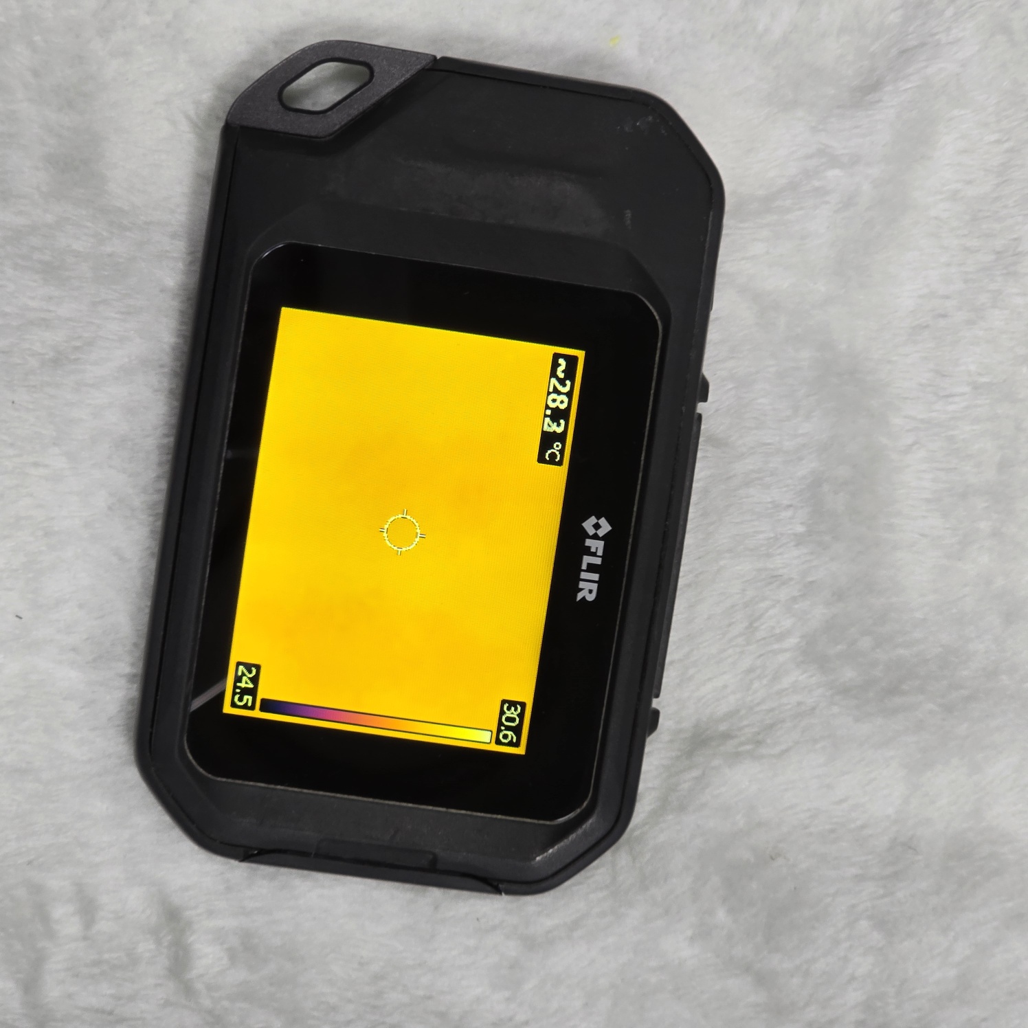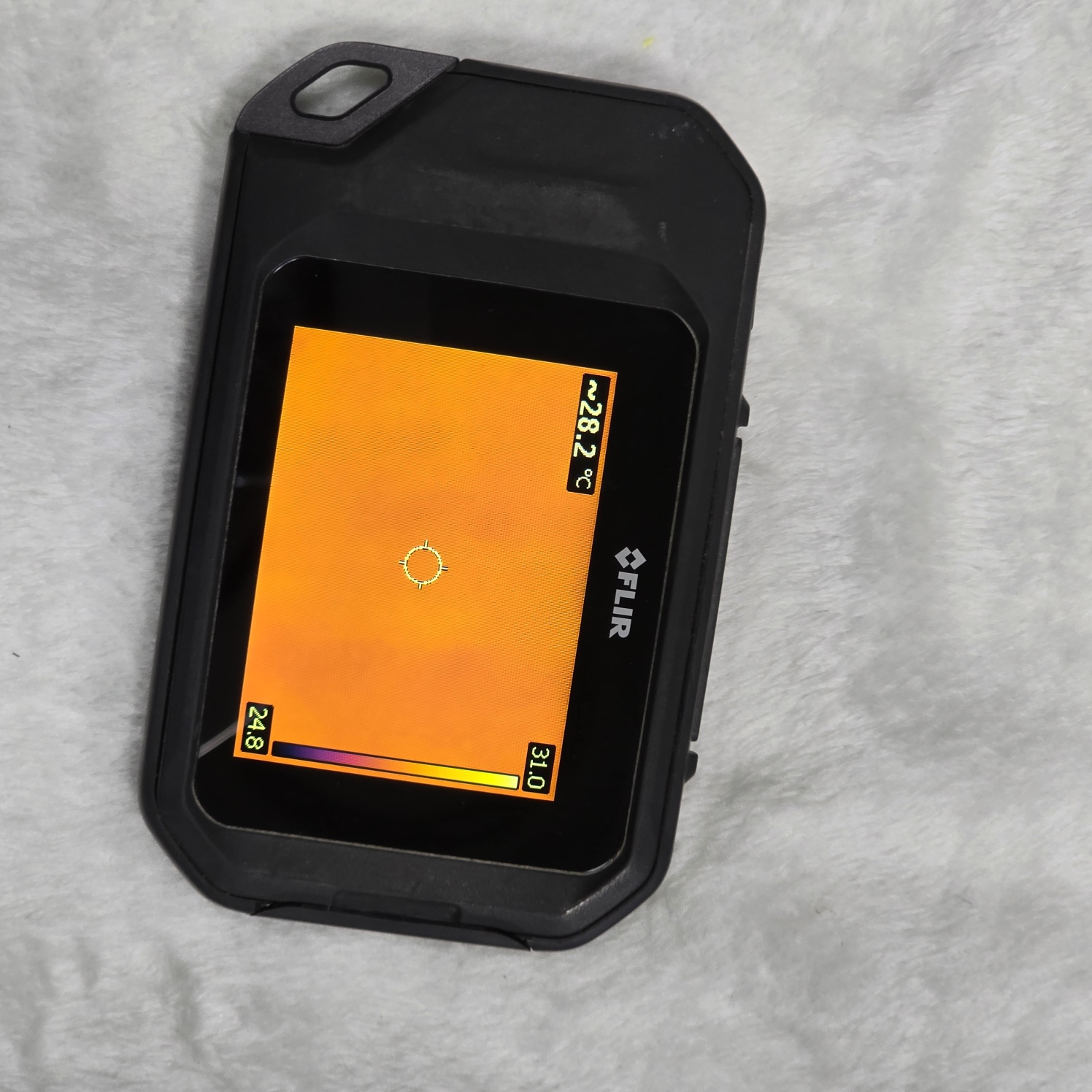 열화상카메라 Flir C2 상단의 왼쪽에 작은 버튼이 전원버튼입니다. 약 2초 정도 살짝 누르면 전원이 켜지죠.