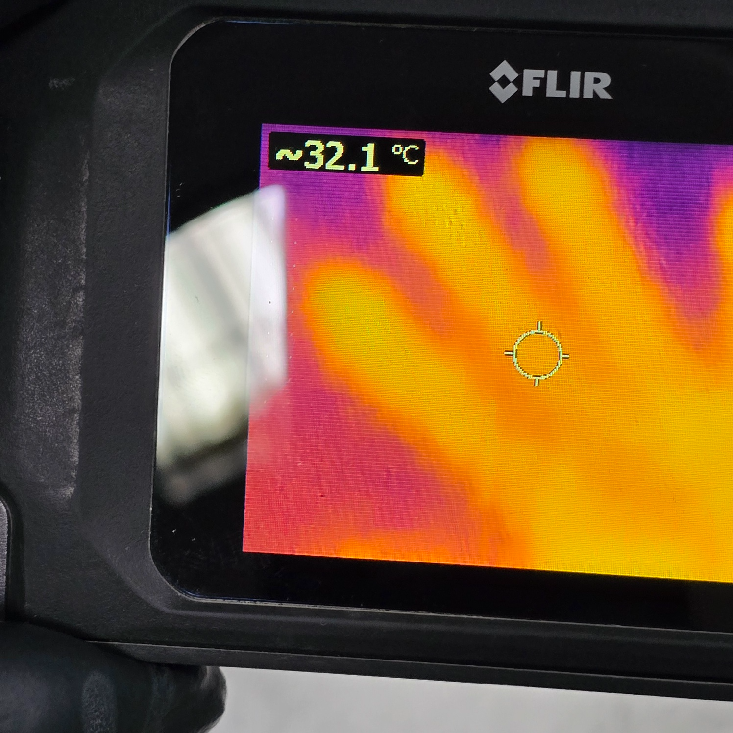 5. 재미있는 사실인데요. 손바닥을 가져다 대었던 담요에는 아직 손바닥의 온기가 남아있습니다. 손이 없는데도 불구하고 잔열이 남아 32도 정도의 온도를 보여주네요.