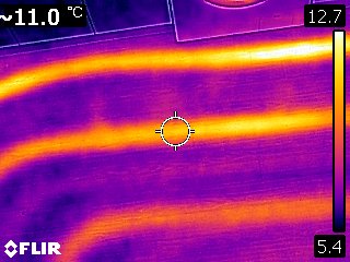 또한 바닥 난방에서도 전반적으로 비슷하지 않고, 특정 파이프나 특정 부위만 어둡게 나오는 경우라면 난방의 유속 흐름이 원활하지 않다고 볼 수 있습니다. 이때 열화상카메라의 중심에 있는 원 포커스에 맞춰 지속적으로 온도차이를 비교하시면 도움이 됩니다.
